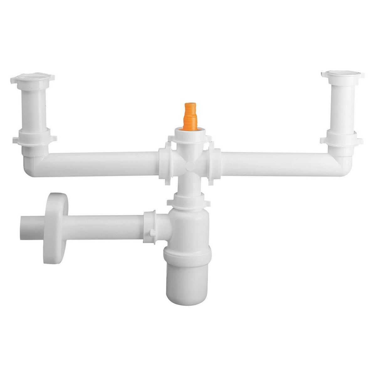Sifone a bottiglia per lavelli a due vasche senza piletta completo di raccordi. Con attacco lavastoviglie diam. 20-25 verticale