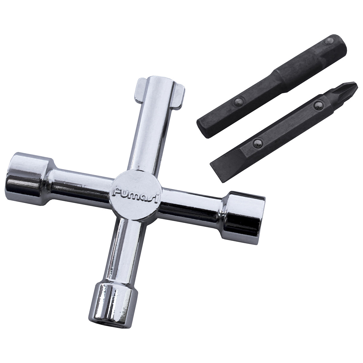 Chiave a 4 usi in acciaio inox resisistente all'uso. Quattro diverse forme tra cui 2 forme quadrate, 1 triangolo e 1 forma di chiave. Con 2 inserti, viti ad intaglio 1x7 mm e viti con impronta a croce PH2