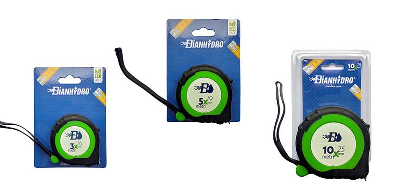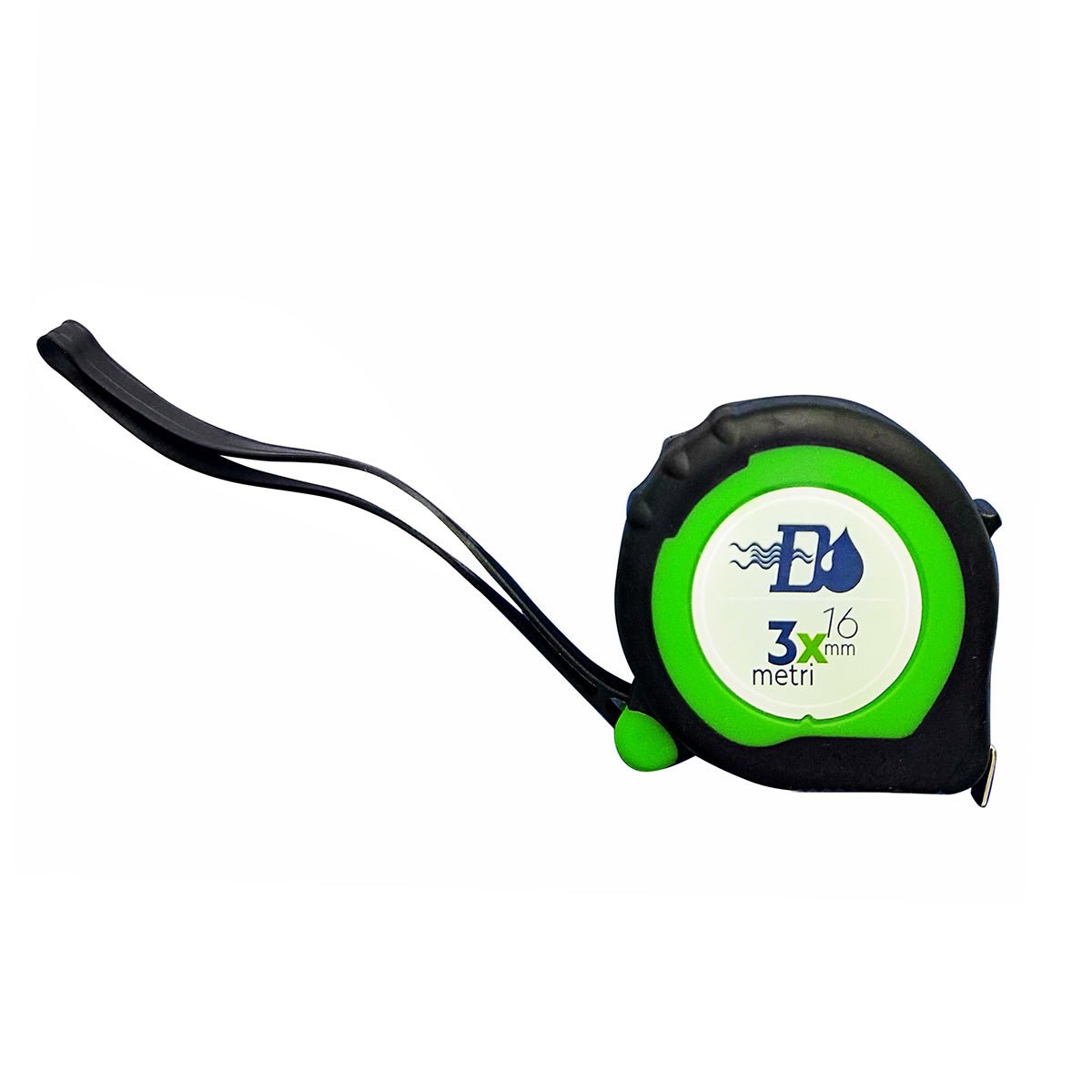 Flessometro con cassa in ABS e rivestimento antiurto in gomma. Gancio multipresa in metallo, doppio bloccaggio del nastro con rientro automatico. Fornito di clip e laccio