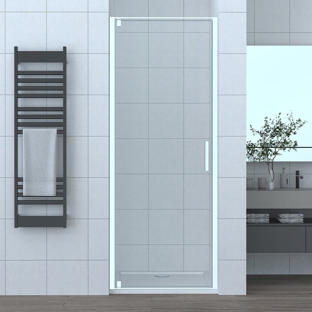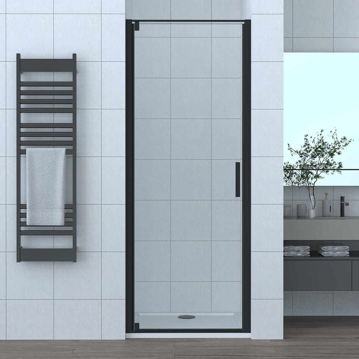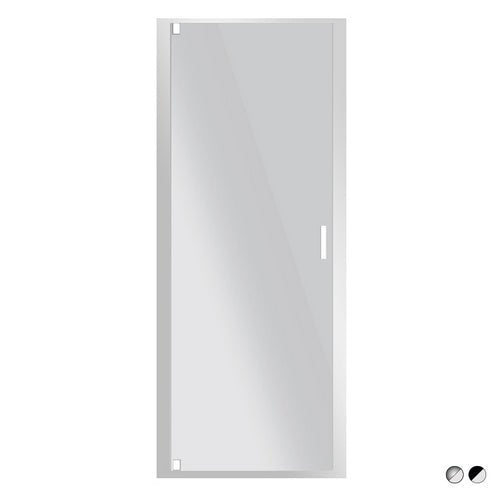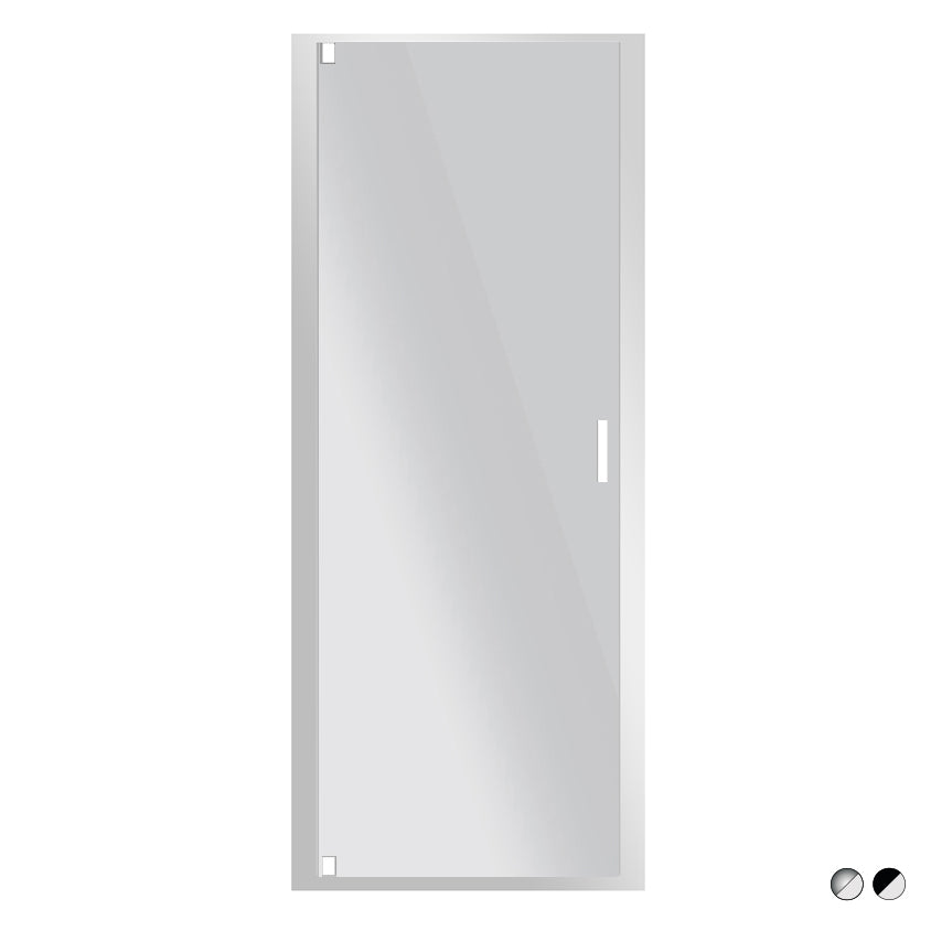 Schwenkbare Duschtür der Linie Velvet, reversibel. Transparentes Sicherheitsglas, 6 mm, mit Profilen in Chrom- oder Schwarzoptik. Das untere Profil ist dünner als das obere und dient als Wasserbarriere. Höhe 200 cm. Chromgriff. Installierbar mit der festen Wand der Linie Velvet oder in einer Nische. Produkt entspricht den Normen EN 14428:2004.