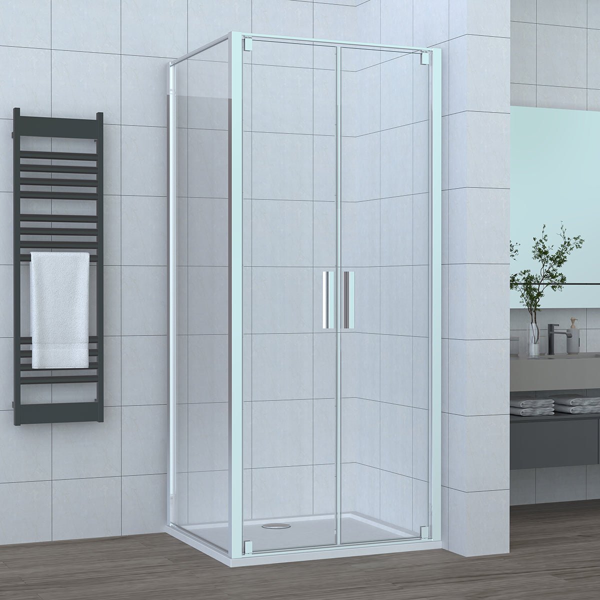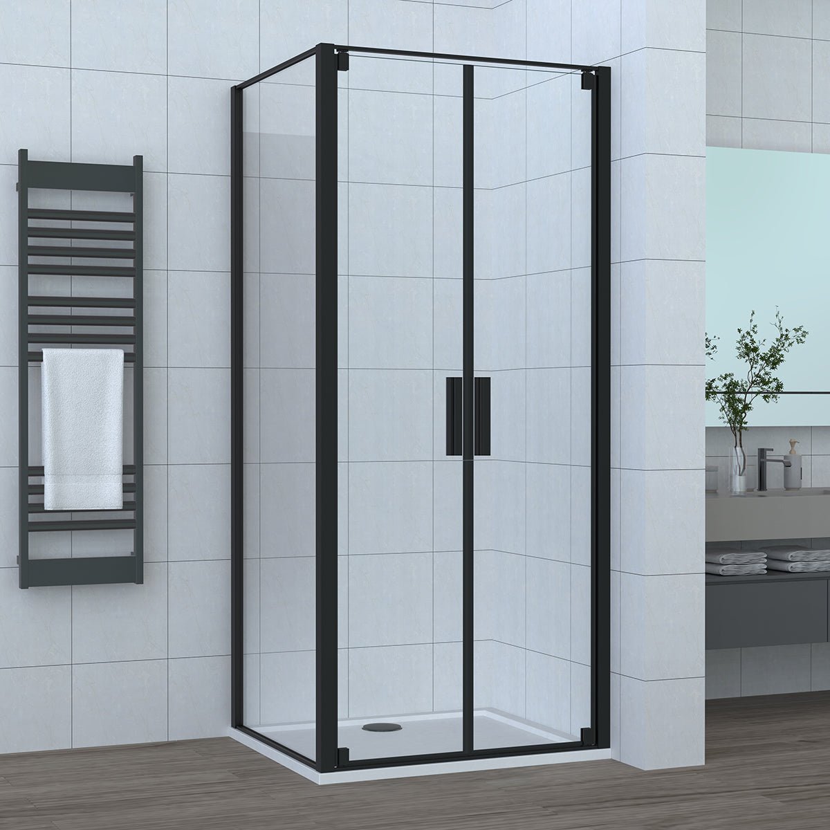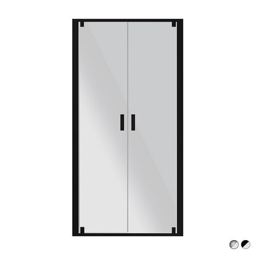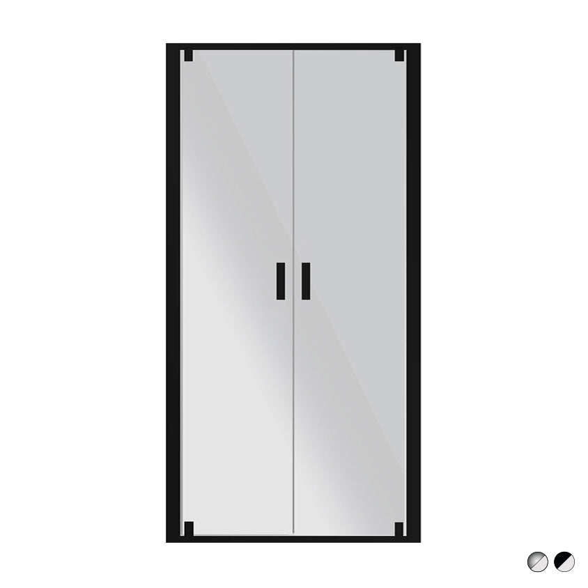 Doppelte Pendeltür für die Dusche mit Profilen in den Ausführungen Chrom oder Schwarz und Kristallglas. Das untere Profil ist dünner als das obere und dient als Wasserbarriere. Höhe 200 cm. Doppelte verchromte Griffstange. Installierbar mit der festen Wand der Linie Velvet oder in einer Nische. Produkt hergestellt gemäss den Normen EN 14428:2004.
