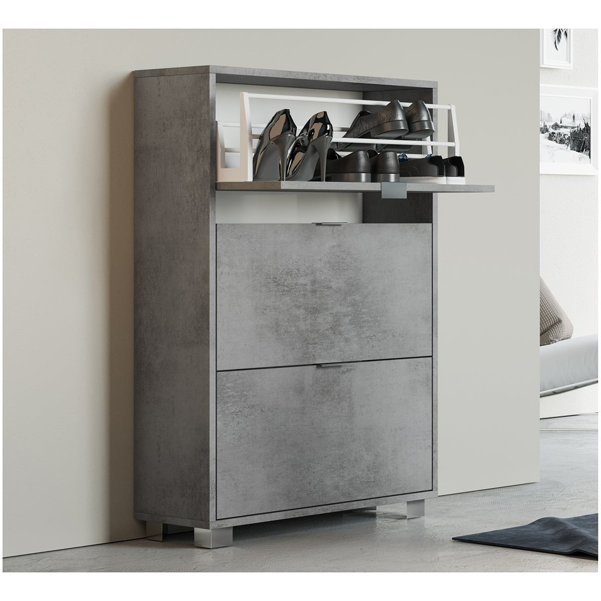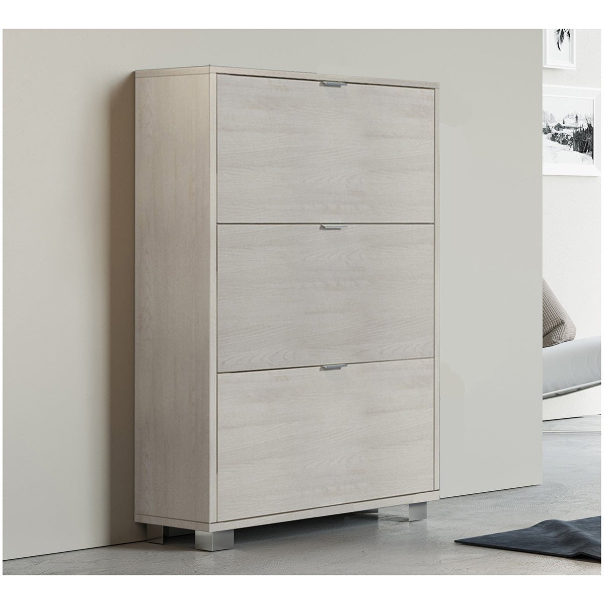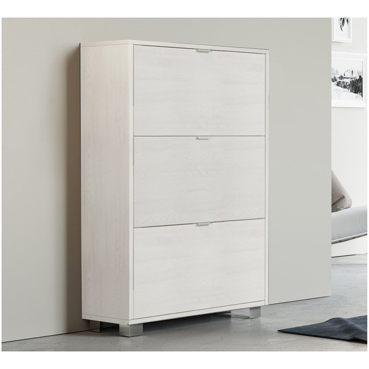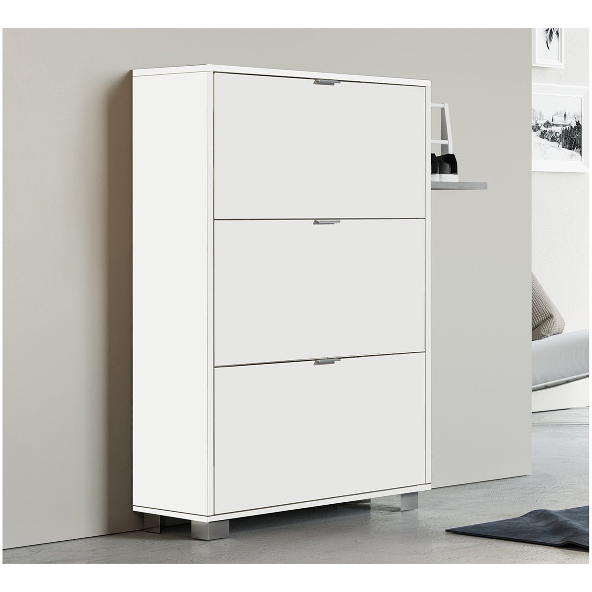 Schuhschrank mit 3 Klappen und doppeltem Gitter, verchromte Füsse. Hergestellt aus melaminbeschichtetem Spanplattenmaterial mit einer Stärke von 16 mm. Geliefert mit 4 Füssen und Befestigungsschrauben.