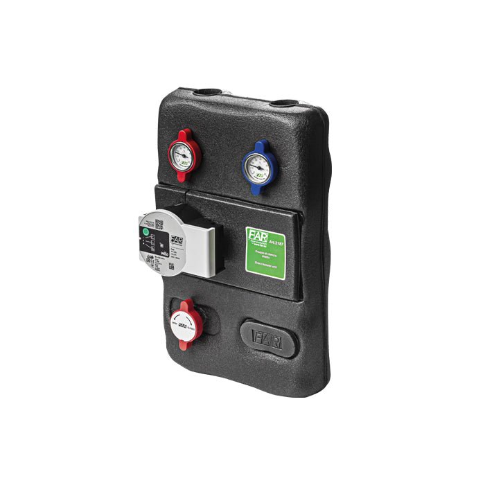 Direkte Freigabeeinheit für Kühlung und Heizung, komplett mit: Hochleistungs-Elektronikpumpe. Absperrventil. Nr. 2 Thermometer Skala 0/80°C. Isoliergehäuse aus PPE. Abstand der Anschlüsse: 125mm. Abstand der Pumpe 180 mm.