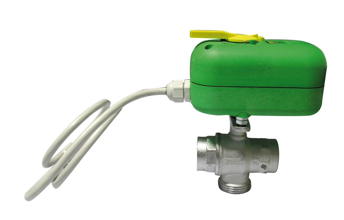 3-Wege-Umlenkventil verchromt mit Kugel, komplett mit elektrischem Stellmotor mit manuellem Entsperren, mit Versorgungsspannung 230 V.