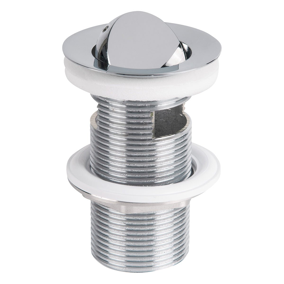 Ablaufgarnitur aus verchromtem Messing mit vollständig integriertem drehbarem Stopfen. Mit Ablaufgarnitur H. 90, in der Höhe weitgehend anpassbar; mit Überlauf; rotocromierte Rosette aus Messing.