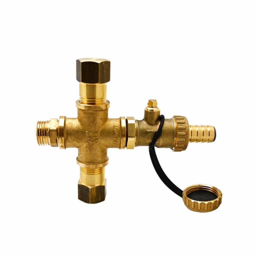 Es handelt sich um ein mechanisches Ventil, das die Frostschutzfunktion im Verbindungskreis zwischen der Ausseneinheit und dem internen Hydraulik-Kit ermöglicht und somit das letzte Schutzelement der Wärmepumpe darstellt, auch bei fehlender Stromversorgung. Das Ventil öffnet sich nach aussen und ermöglicht das schrittweise Entleeren des Kreislaufs, wenn die Temperatur der Anlage auf 1 °C sinkt. Das Ventil schliesst sich, wenn die Temperatur über 4 °C steigt. Das Ventil muss in der Nähe der Ausseneinheit am Rücklauf der Anlage montiert werden, also auf der kälteren Seite. Mechanischer Frostschutz, der an der Ausseneinheit am 3/4 Abflussanschluss installiert werden kann. Besteht aus: 3/4 Zoll männlichem Gewinde und einem 4-Wege-Messingkörper mit Schlauchanschluss und Kugelhahn mit Schraubeneinsatz. 2 Flüssigkeitsstopfen zum Öffnen