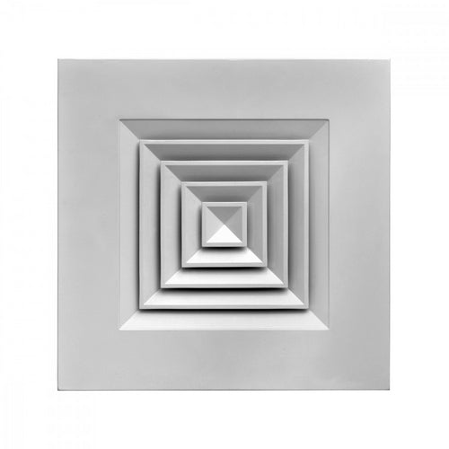 Multidirektionale 4-Wege-Diffusoren auf einem 595x595 Panel mit abnehmbarer Mitte. Aus einem Stück Aluminiumblech, weiss lackiert RAL 9016. Verwendung: An der Decke, in der Zuluft und Rückluft. Installationshöhe: 2,5-3,1 m. Befestigung mit verdeckten Schrauben am Hals des Diffusors