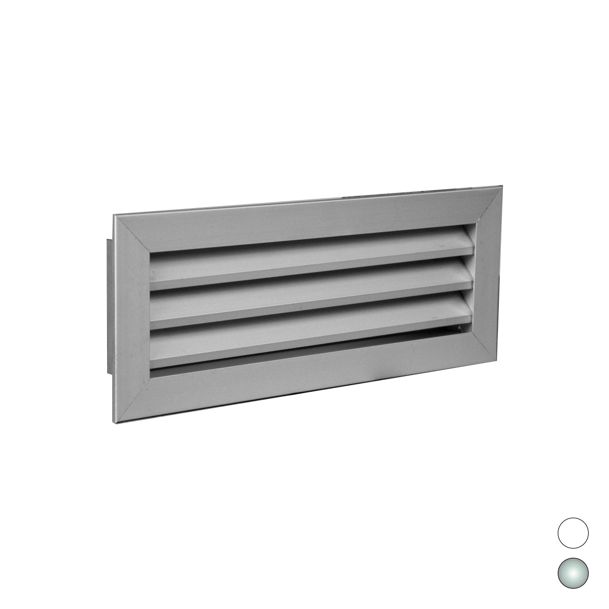 Rücklaufgitter mit festen, um 45° geneigten Lamellen, Abstand 25 mm. Aus Aluminium. Verwendung: an der Wand. Standardbefestigung mit Clips