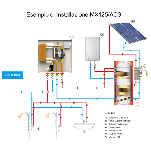 Modul zur Erzeugung von sofortigem Warmwasser (ACS) zur Installation auf zivilen thermischen Speichern. Mit dem Modul kann Warmwasser durch einfaches Entnehmen von technischem Wasser aus einem thermischen Speicher über die Zirkulationspumpe erzeugt werden, die beim Anfordern der Zufuhr durch den Flussmesser aktiviert wird. Einfach zu installieren, erfordert keine elektronischen Steuerungen. Pumpe Para 15/6. Anschlüsse 1/2"-3/4". LxHxB: 405x500x115 mm
