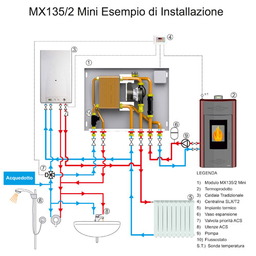 Modul Schnittstelle Kessel/Thermoprodukt und ACS-Erzeugung. Ermöglicht eine optimale Integration der Steuerung des traditionellen Kessels mit einem Thermoprodukt. Das System, ausgestattet mit einem Plattenwärmetauscher mit drei Kreisläufen und einem Flussmesser, produziert ACS mit automatischer Funktion. Pumpe Para 15/6. Anschlüsse 1/2"-3/4". LxHxB: 503 x 500 x 115 mm