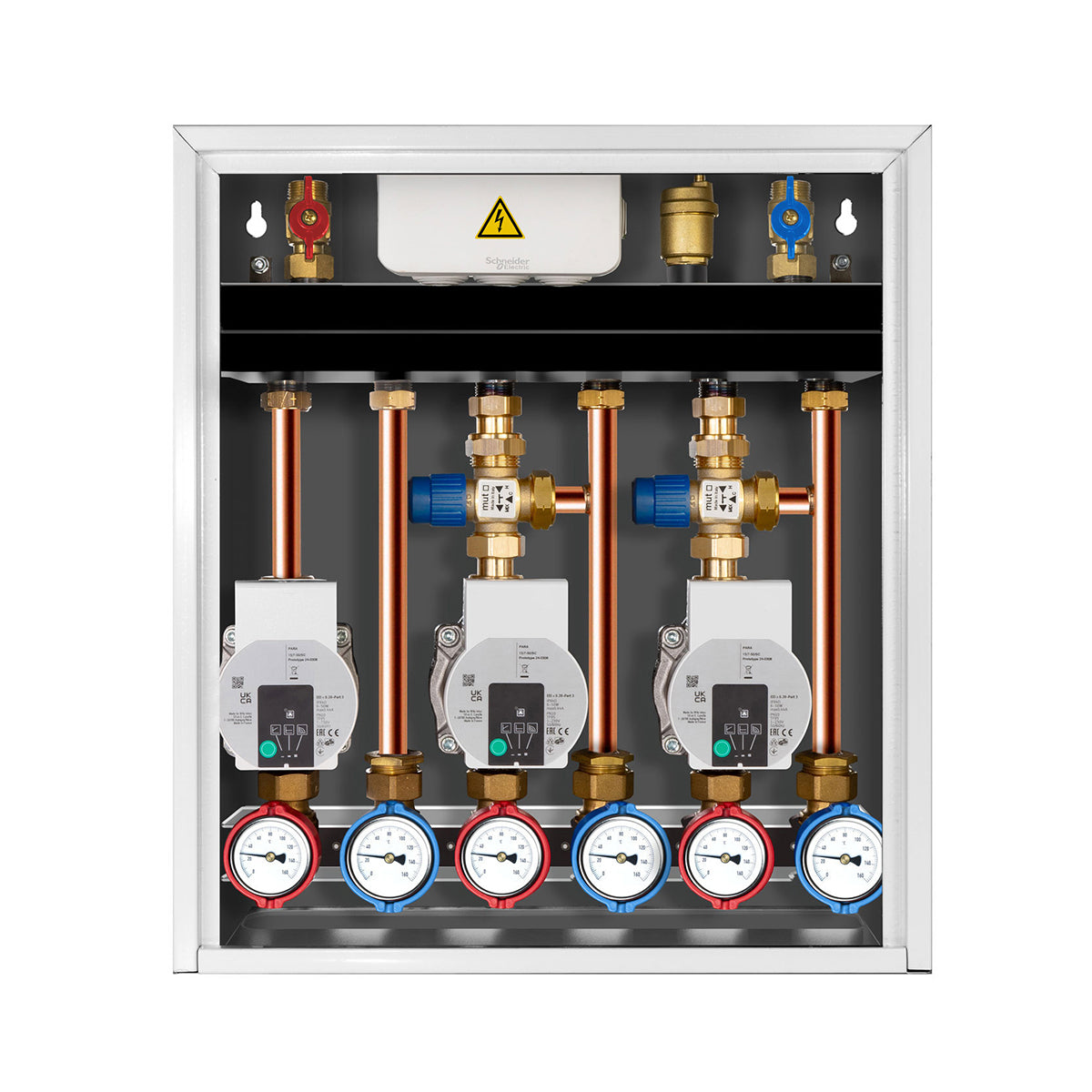 Verteilungsmodul für Mehrzonenheizung. Modul mit einer direkten Zone und zwei thermostatischen Zonen. Zirkulationspumpen Wilo Para 15/7. Zirkulationspumpen gemäss der ERP-Effizienzrichtlinie 2015