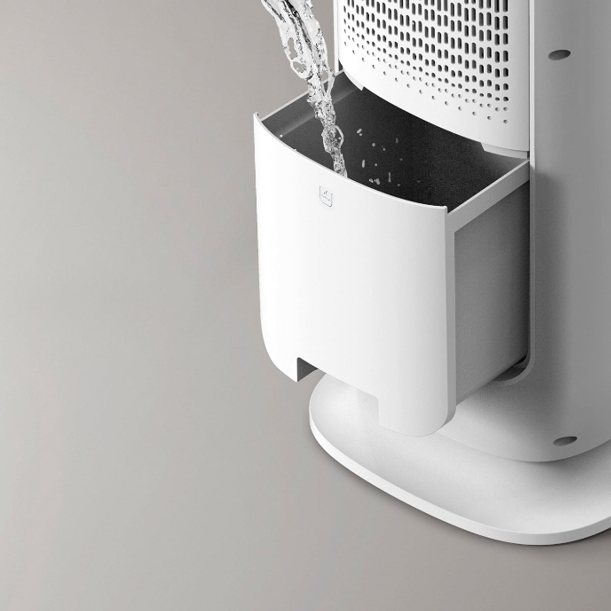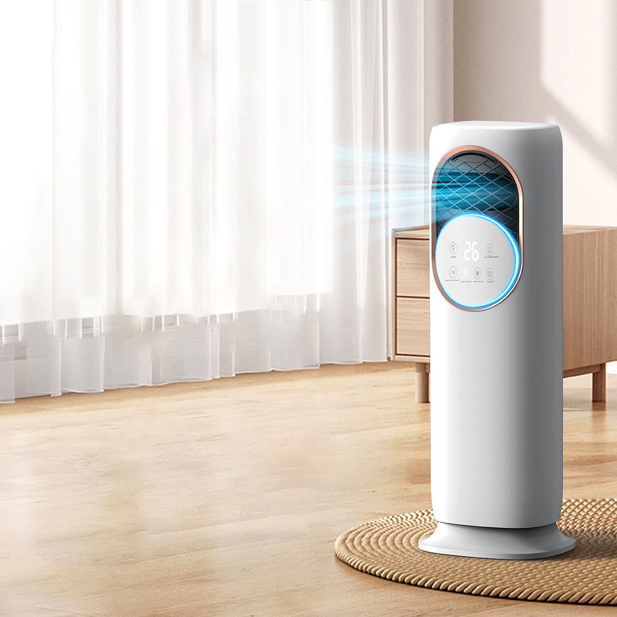 Wasserverdampfer mit 4-Liter-Tank mit Funktionen: COOLER 60W Kühlung durch Vernebelung von Wasser oder Eis, Heizung 900/1800W, UV-Desinfektion, Luftbefeuchter. Mit Fernbedienung. Automatische DS-SX-Drehung. Touchscreen mit Temperaturanzeige. Spannung 220V. Material PP+ABS. Abmessungen 240x210x820mm.