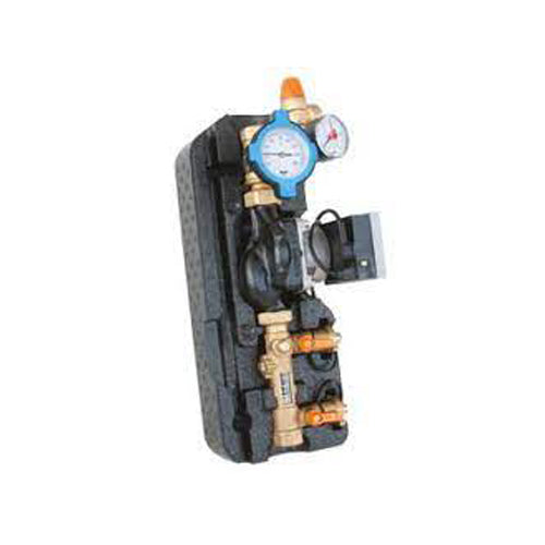 Einfache hydraulische Gruppe für thermische Solarsysteme einschliesslich Isolierung. Version mit Entgasungsgerät, Kugelhahn mit integriertem Thermometer, Sicherheitsgruppe 6 bar und mechanischem Durchflussmesser. Version 1-10 L/min Grundfos SOLAR 15-65 Pumpe