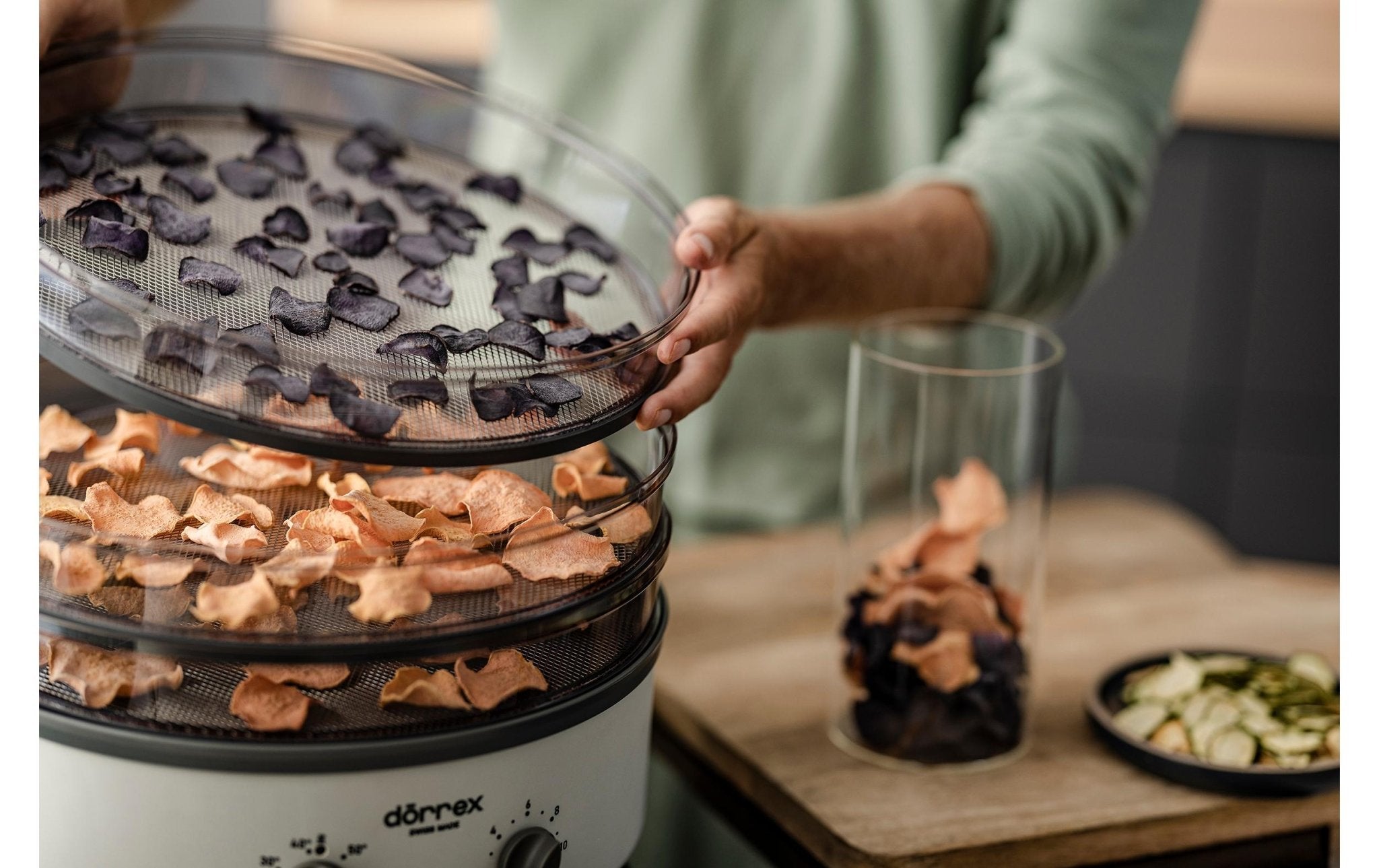 Dörren ist die natürlichste und einfachste Art, eine Vielzahl von Lebensmitteln haltbar und gesund zu machen. Neben der verlängerten Haltbarkeit ist der Erhalt wertvoller Nährstoffe ein klarer Vorteil! Zudem sind selbstgetrocknete Produkte frei von Konservierungsstoffen. Gesunde Chips aus Obst und Gemüse werden bei Jung und Alt immer beliebter. Als Snack für zu Hause oder unterwegs. Nicht nur lecker, sondern auch vitaminreich und zuckerfrei. Entdecken Sie diese Zubereitungsart und lassen Sie sich vom hervorragenden Geschmack der getrockneten Produkte überraschen!