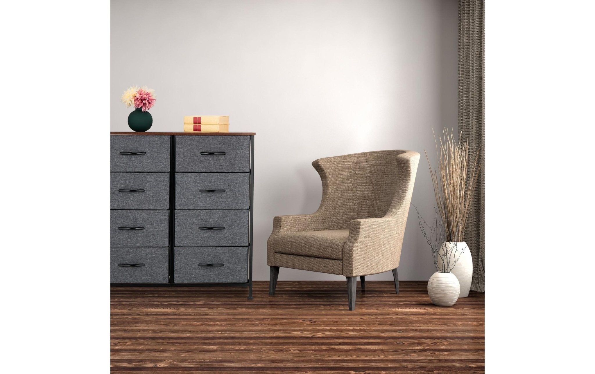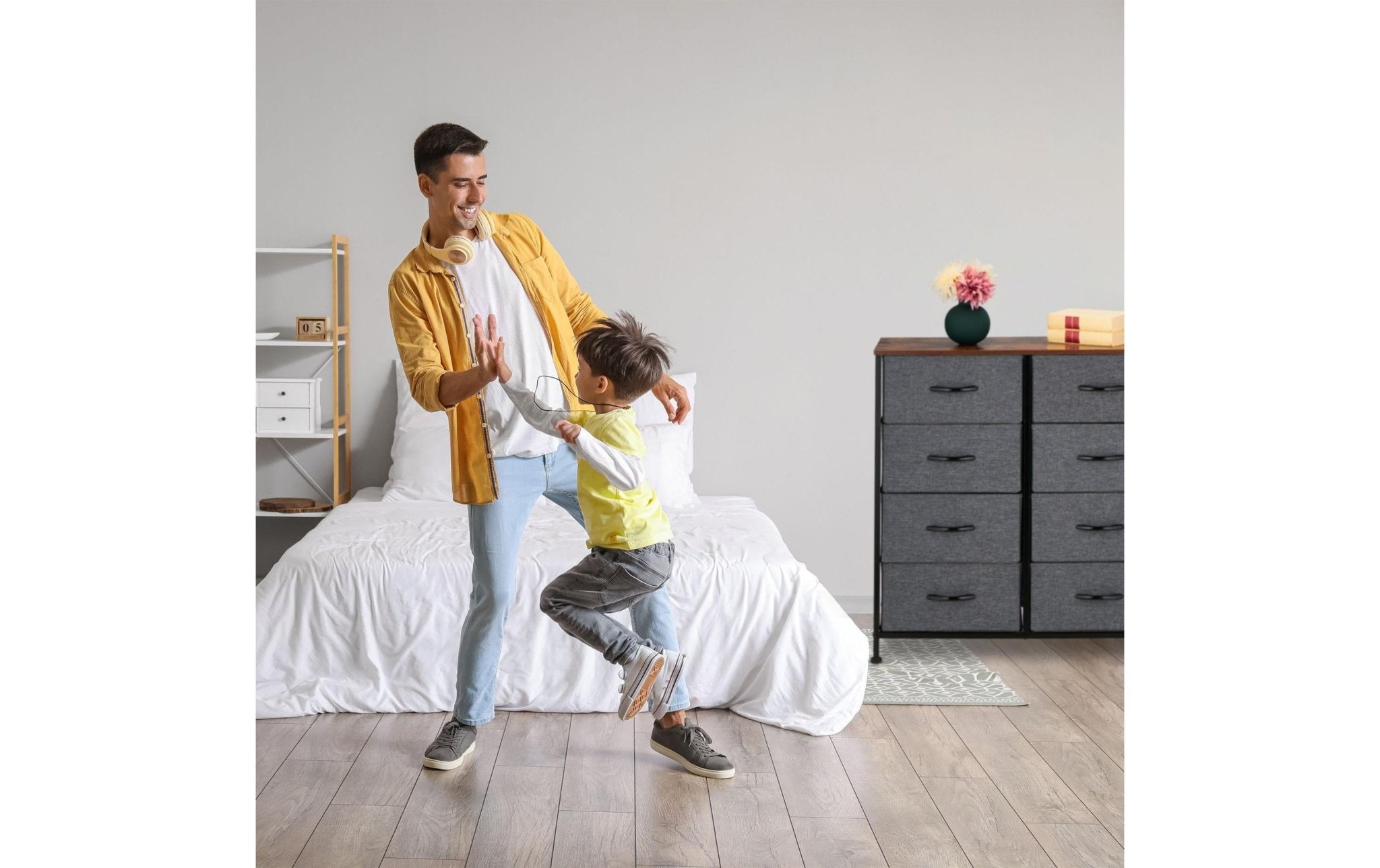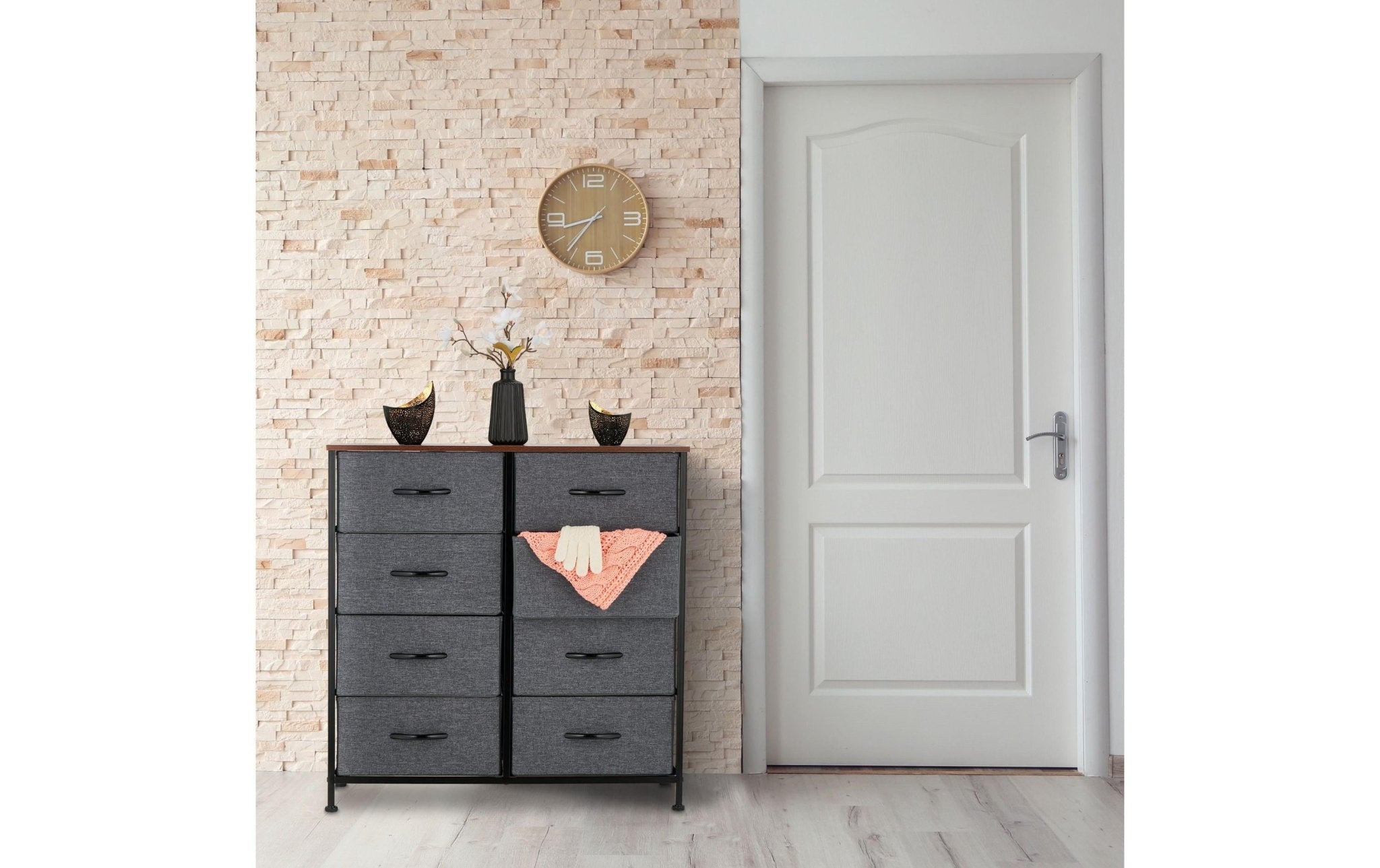 Diese Kommode bietet Ihnen mit ihren 8 Schubladen ausreichend Stauraum. Egal ob für Bücher und Spiele im Wohnzimmer, Kleidung im Schlafzimmer oder Mützen und Schals im Flur – der geräumige Schubladenschrank ist vielseitig verwendbar. Auf der oberen Ablage können Sie Dekoartikel oder Pflanzen in Szene setzen. Auch optisch überzeugt die moderne Hochkommode dank ihrer gelungenen Kombination aus grauem Stoff, dunkelbrauner Holzoptik und dem schwarzem Rahmen aus robustem Metall. Inklusive Wandmontagematerial zur sicheren Befestigung