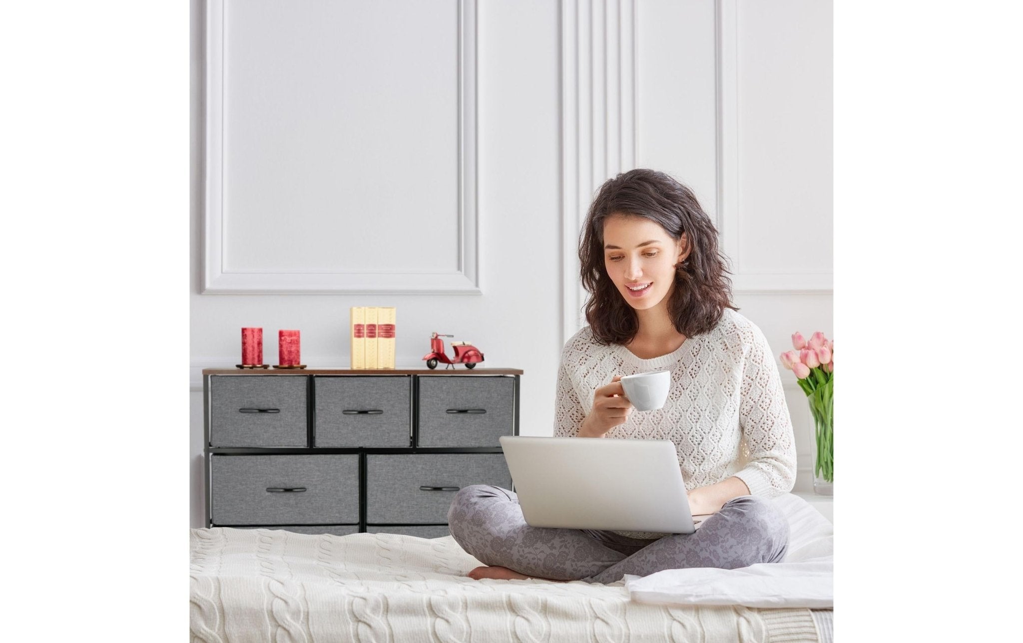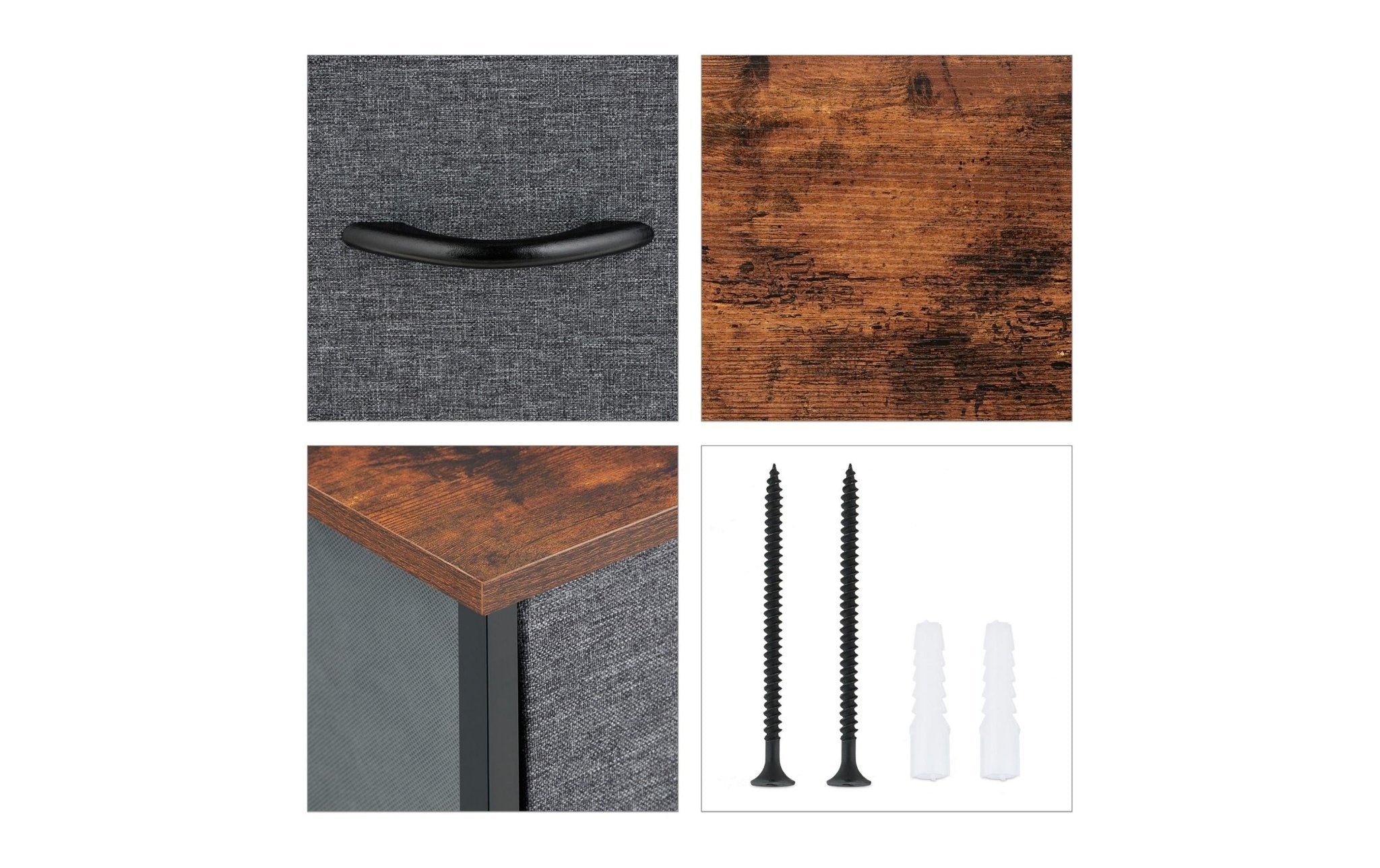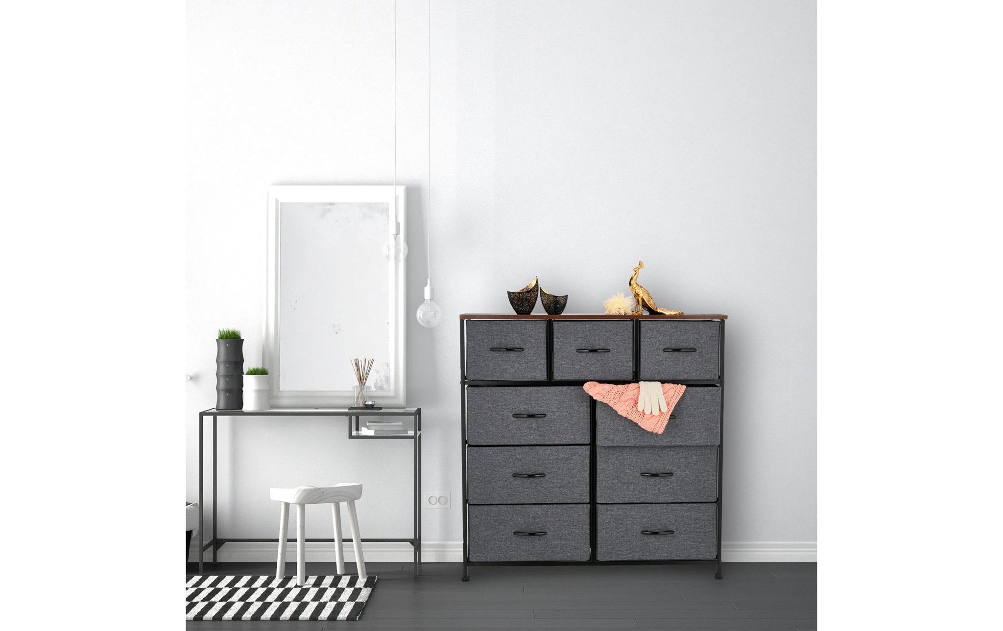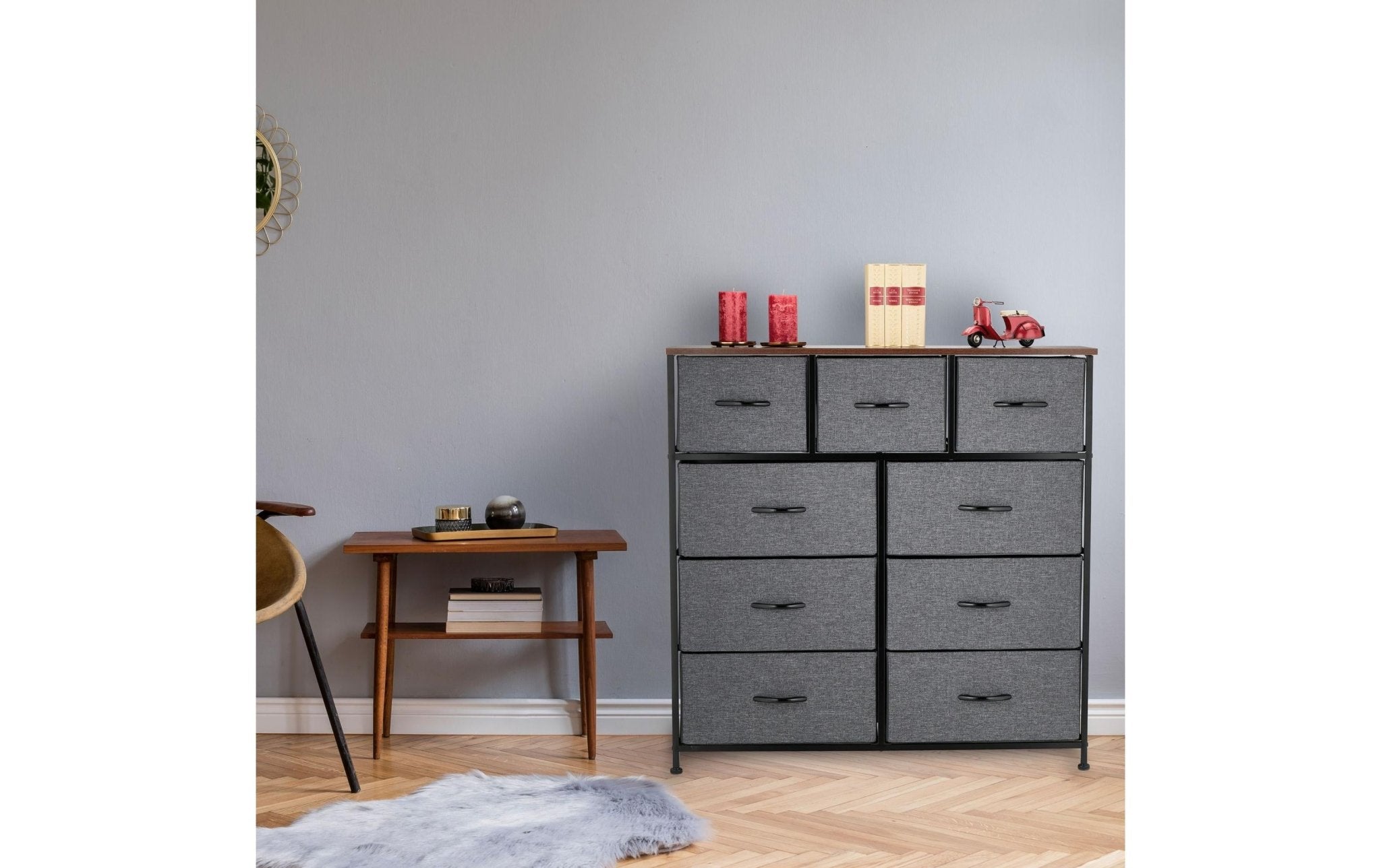 Diese Kommode bietet Ihnen mit ihren 9 Schubladen ausreichend Stauraum. Egal ob für Bücher und Spiele im Wohnzimmer, Kleidung im Schlafzimmer oder Mützen und Schals im Flur – der geräumige Schubladenschrank ist vielseitig verwendbar. Auf der oberen Ablage können Sie Dekoartikel oder Pflanzen in Szene setzen. Auch optisch überzeugt die moderne Hochkommode dank ihrer gelungenen Kombination aus grauem Stoff, dunkelbrauner Holzoptik und dem schwarzem Rahmen aus robustem Metall. Inklusive Wandmontagematerial zur sicheren Befestigung