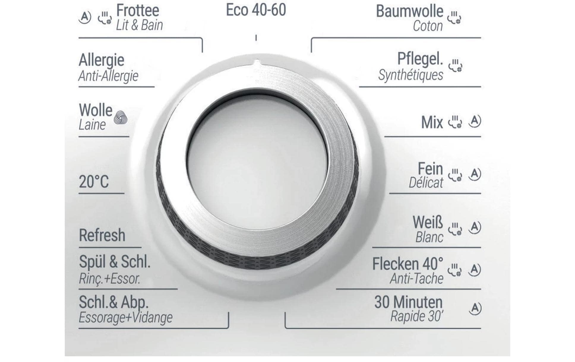 - Funktionen: Allergieprogramm, Dampf, Kindersicherung, Knitterschutzfunktion, Nachlegefunktion, Schaumerkennung, Wasserschutzsystem, Zeitprogramm