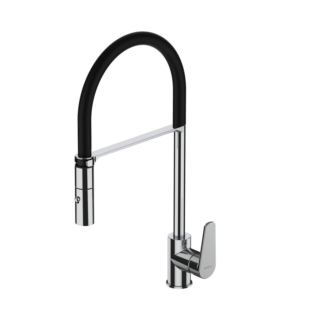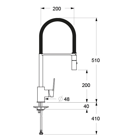 Einhebelmischer für Semi-Pro-Spüle mit Schlauch, der mit einer mattschwarzen PVC-Hülle ummantelt ist, drehbarer Auslauf, seitlicher Griff, herausziehbare Handbrause mit 2 Strahlen aus Metall und erleichtertem Anschluss. Keramikkartusche, Durchfluss 12 l/min. Softpex-Zuführungsschläuche 3/8". Befestigung mit Schnellmontagesystem.